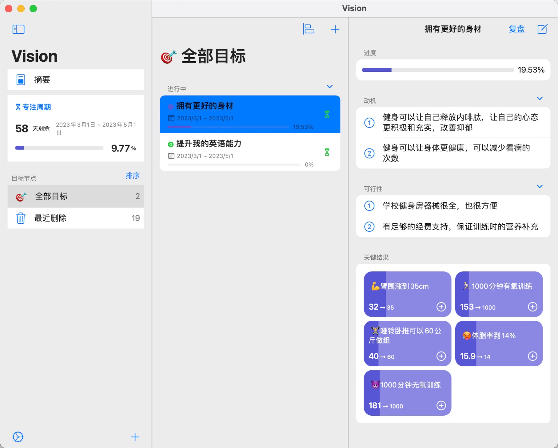 本周我的热情明显还是在健身上,根据运动手表的记录,本周通过运动消耗了8257大卡,日均1180大卡,我真的好恐怖。在Vision中制定了健身的OKR,本来设置的周期为两个月,这一周直接完成总目标的19%。就在今天晚上,室友问我:你除了健身还有别的热情吗?我开始觉得不能再这样,经过两个月的不断实践,我已经掌握了无氧训练中相当有效的方法,我只需要再花点时间,将这些简化成一个训练系统,然后保持节奏就行,不需要我再投入过度的注意力了。